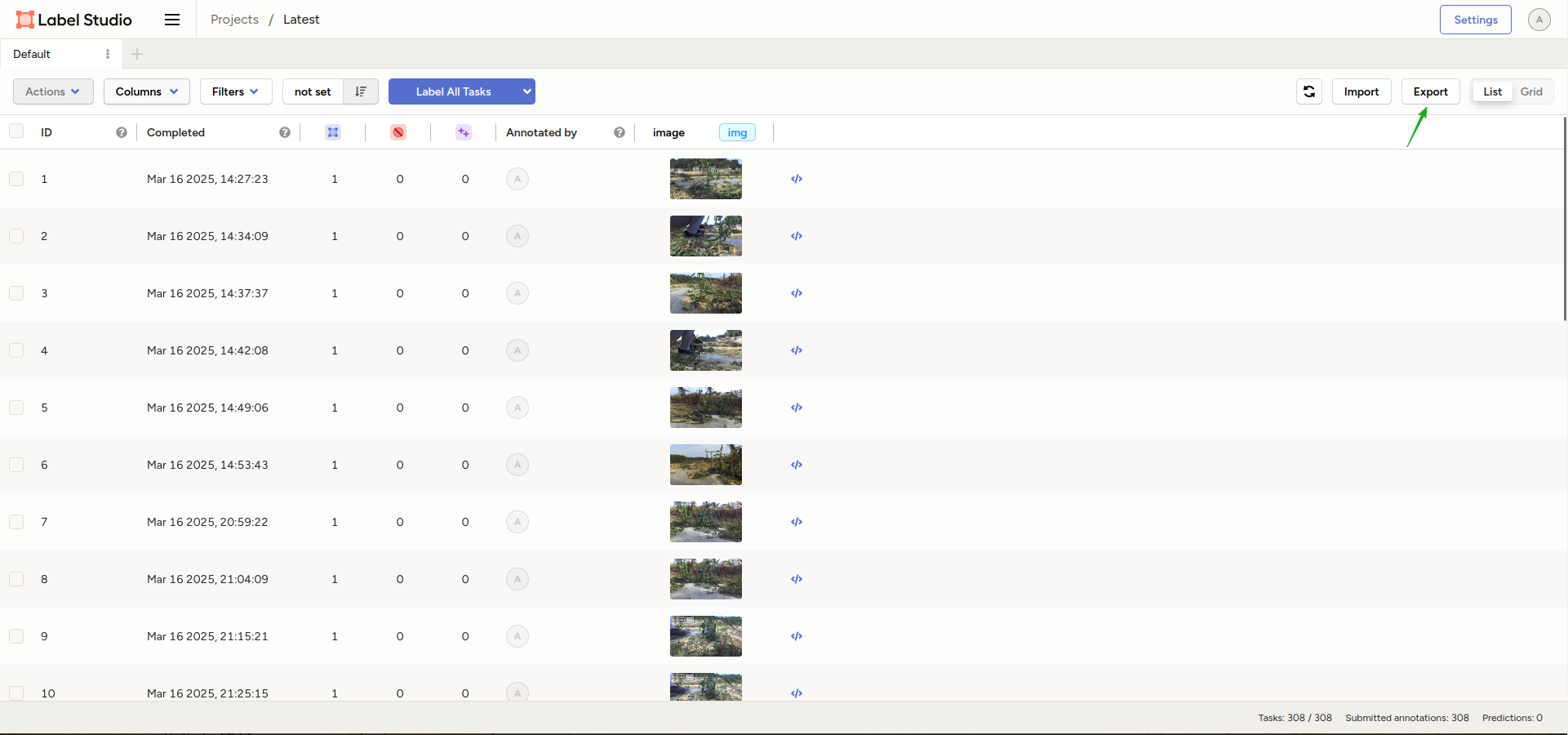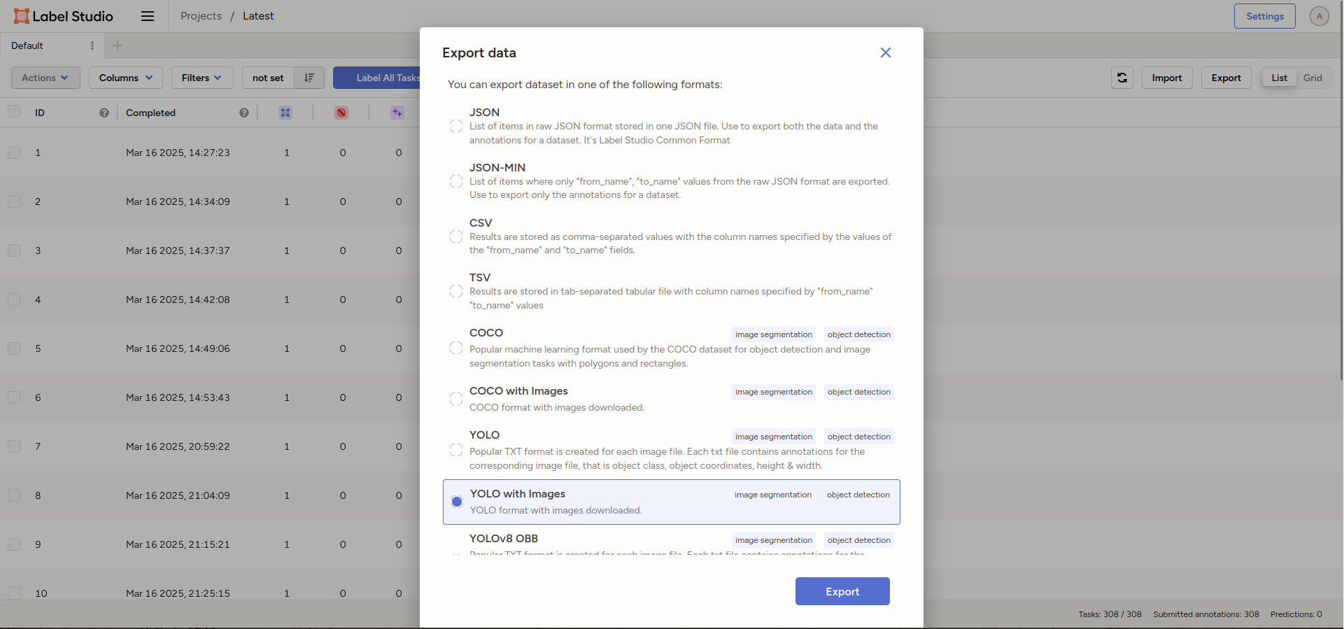 进入需要导出的 Label Studio 项目中,在界面右上角有一个“Export”按钮,点击 Export,在弹出的菜单中选择“YOLO with Images”