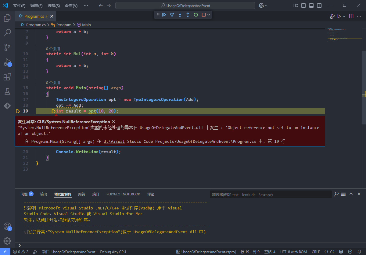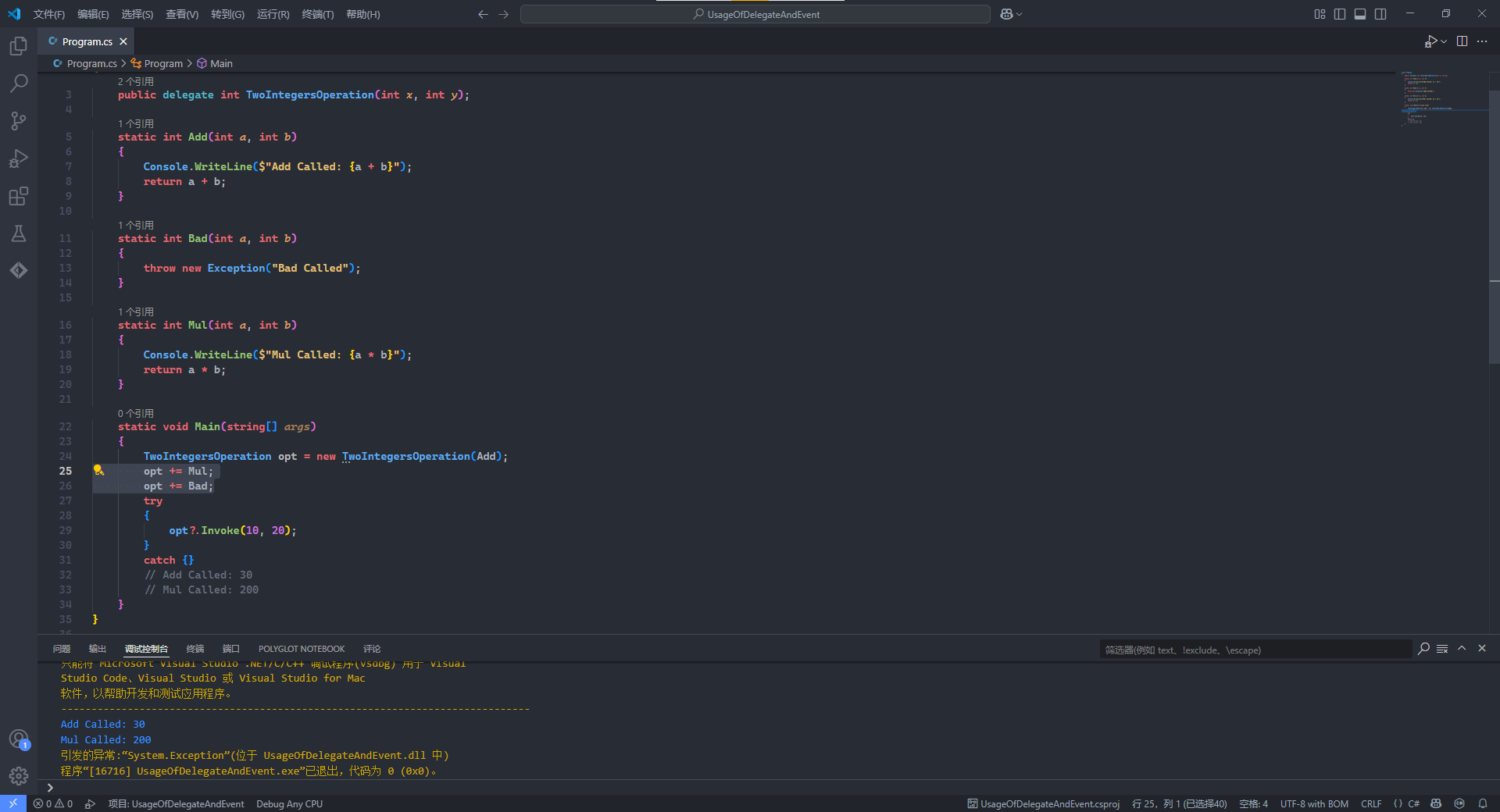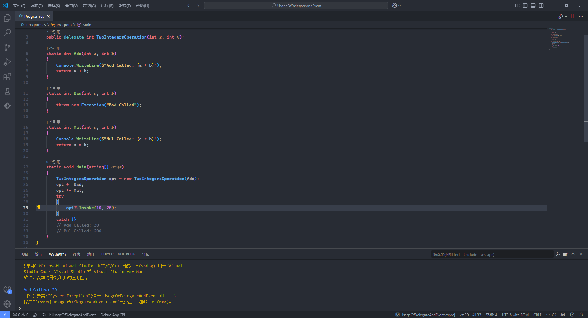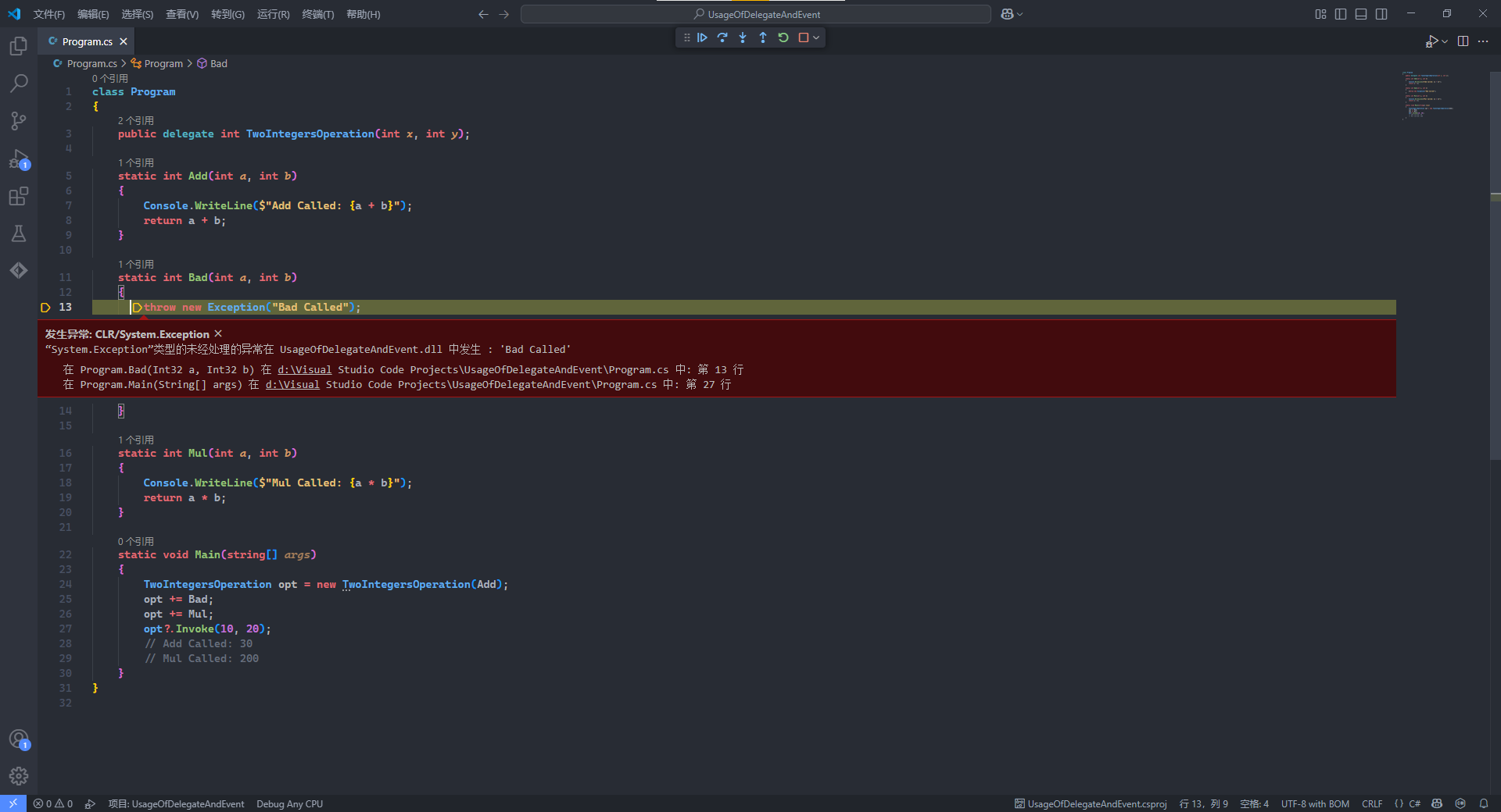 - 若为委托添加了多个函数,而在执行到某个函数时抛出了异常,那么在这个函数后面的函数不会被执行。