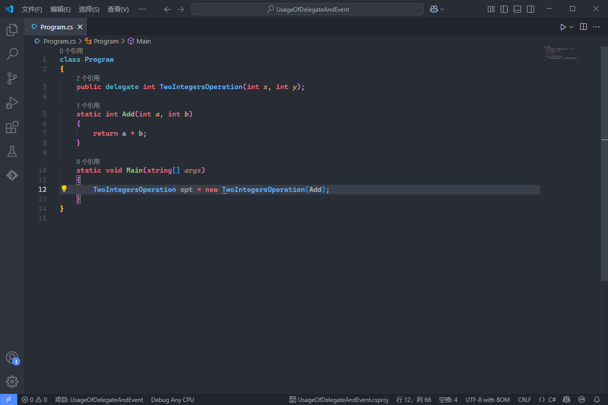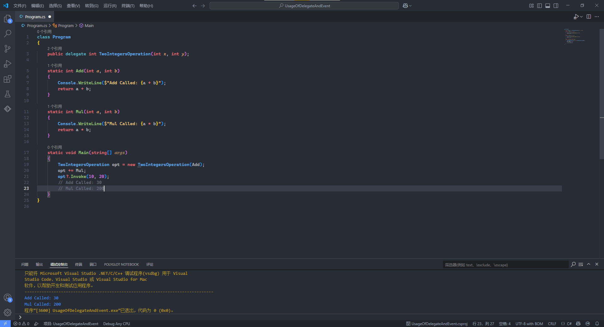 至此,我们已经成功声明了一个委托,并为该委托指定了对应执行的函数。