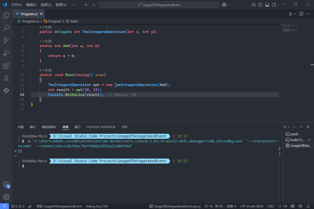 前面也提到了,委托是引用类型,所以使用方法与类相似,所以接下来我们就在 Main