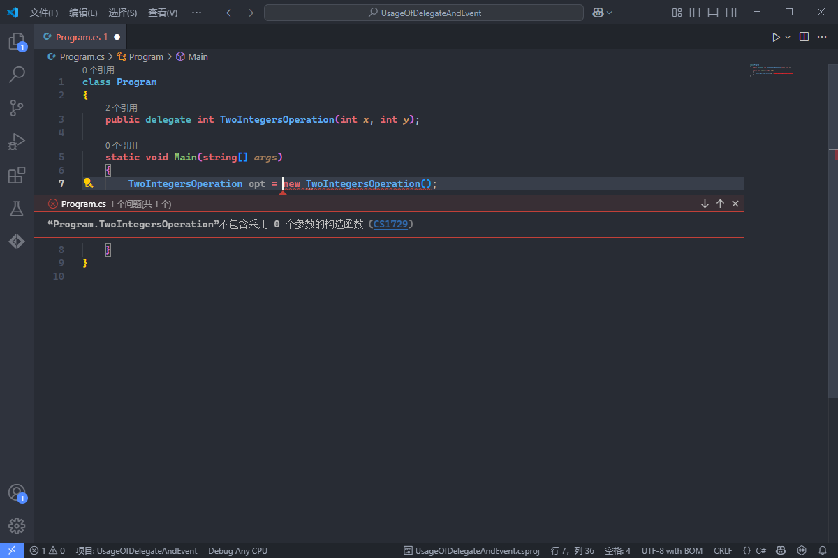 好像不对,怎么编译器报错了,提示“‘Program.TwoIntegersOperation’不包含采用 0 个参数的构造函数(CS1729)”: