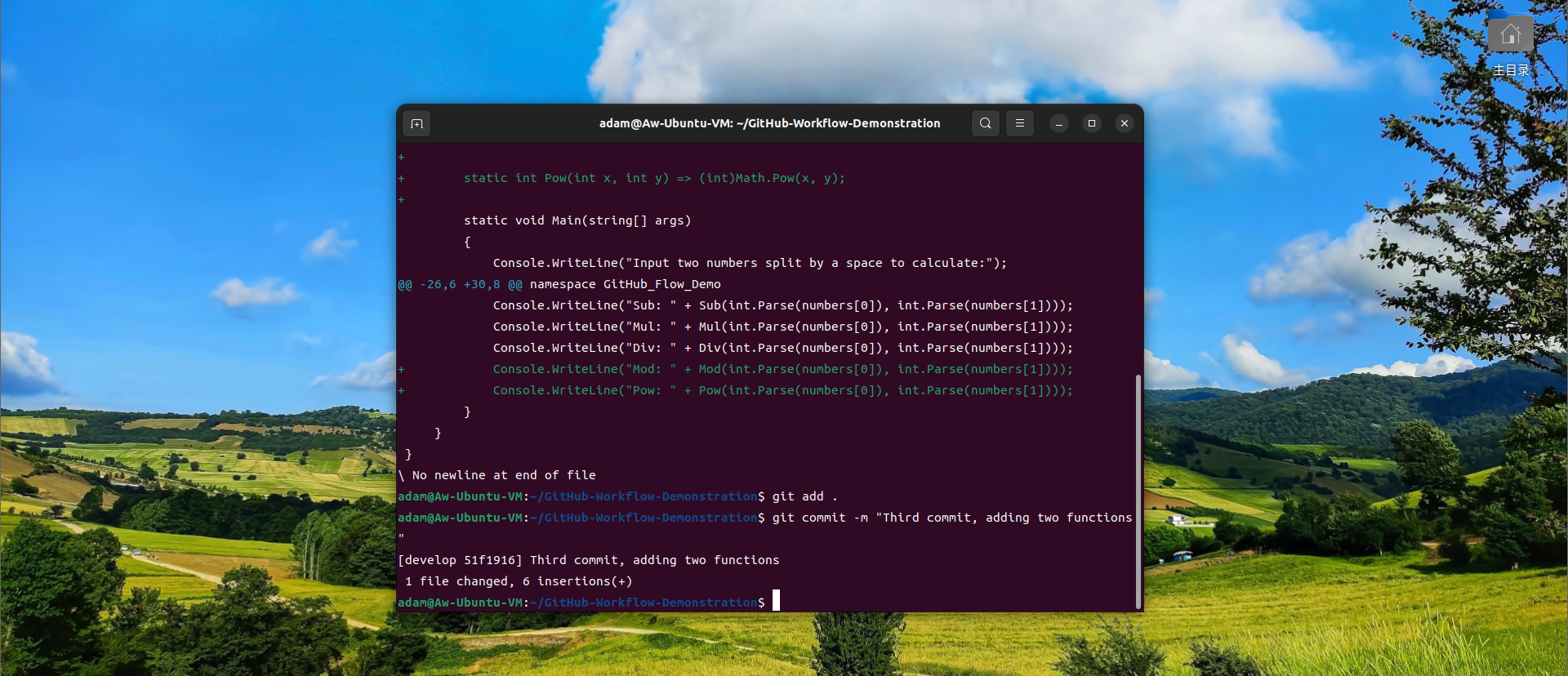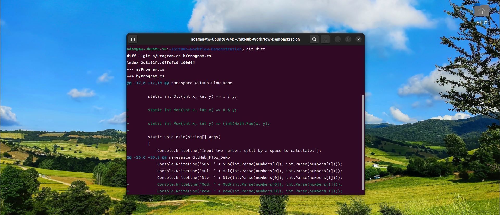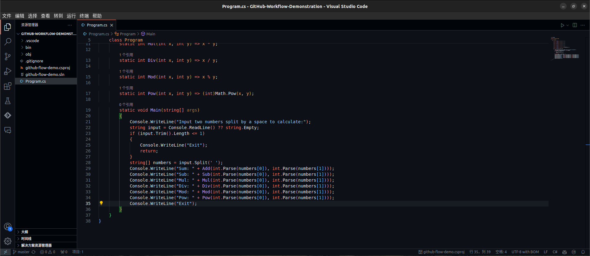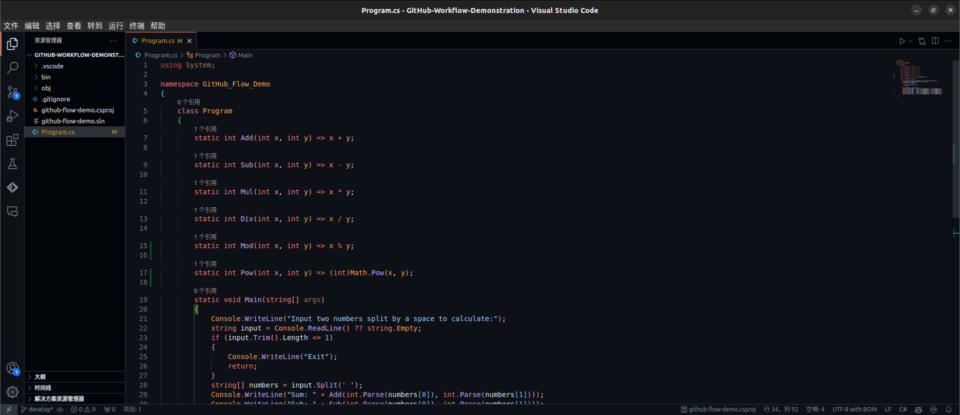 此时,我们就可以在我们的新分支上开始我们对代码的编辑更改了。本文示例中的项目是一个计算两个整数之间各种操作关系的 C#
