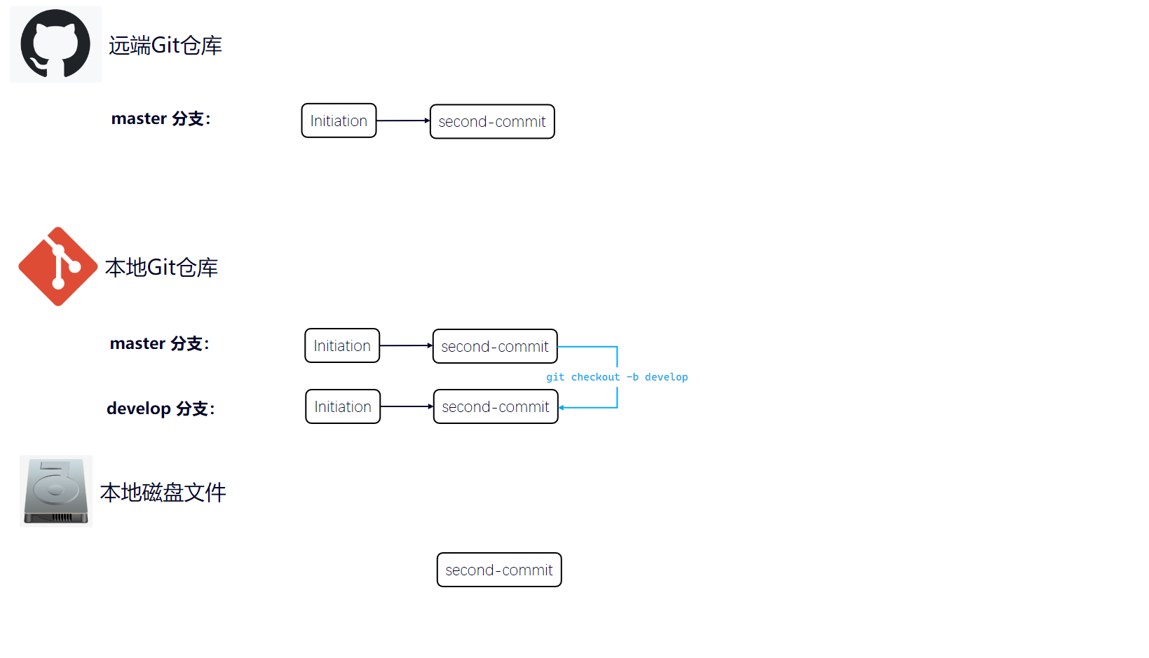 命令会创建一个新分支,并将当前所处的分支(master 分支)复制一份到此分支。我们创建一个名为 develop 的分支,其命令为: