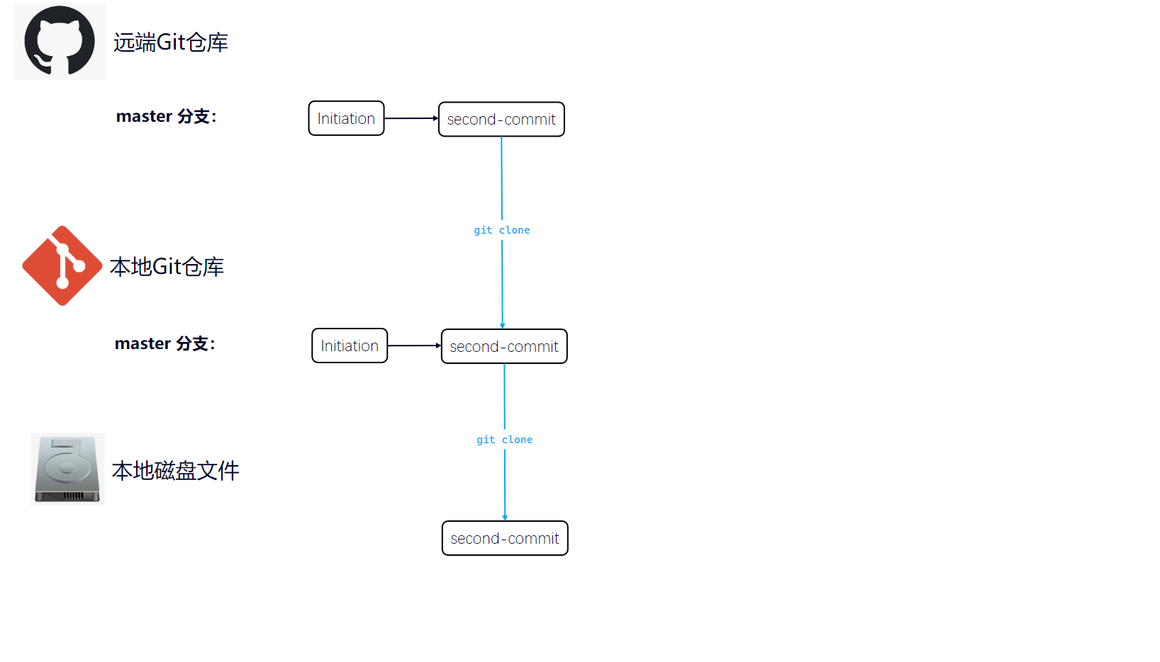 不难从 GitHub 页面看到,这个远程仓库已经有了两个提交,且都是 master 分支上的提交。因此,Git 分支的图谱为:
