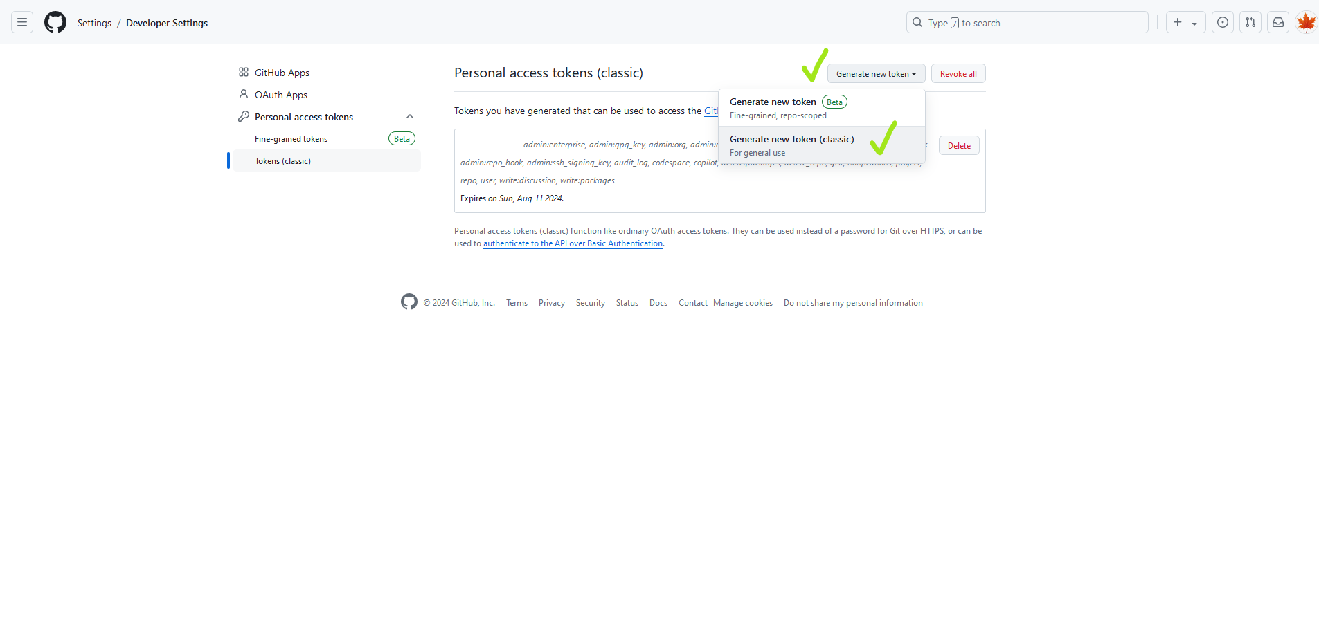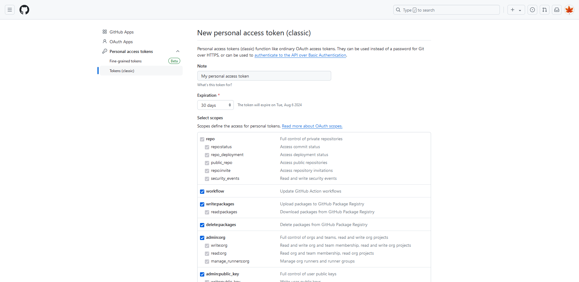 若您从未配置过 GitHub 验证相关的凭证存储,那么在推送时需要输入您的 GitHub 用户名与对应的密码。请注意,从2021年起,GitHub 不再支持使用 GitHub 账户名与密码的方式进行验证,取而代之的是 GitHub 账户名+个人许可令牌的方式。若您从未配置过 GitHub Personal Access Token,请访问 此处 以了解更多,本文仅展示一个获取 Personal Access Token 的简单流程: