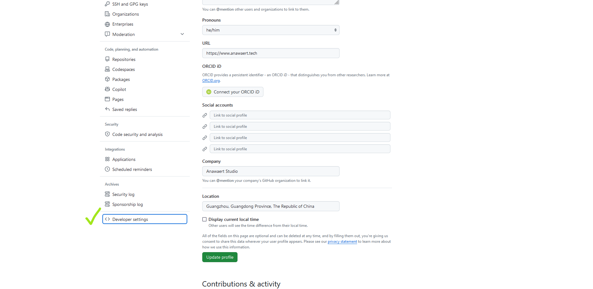 首先进入 GitHub 的个人设置页,在左边栏中最下端找到“开发者设置”: