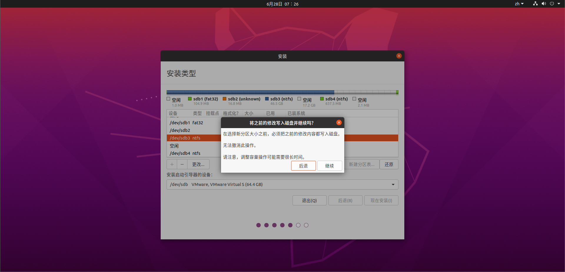 请注意,如格式化与分区大小调整的操作在安装程序中进行时是不可逆的,请务必确认后再进行下一步的操作: