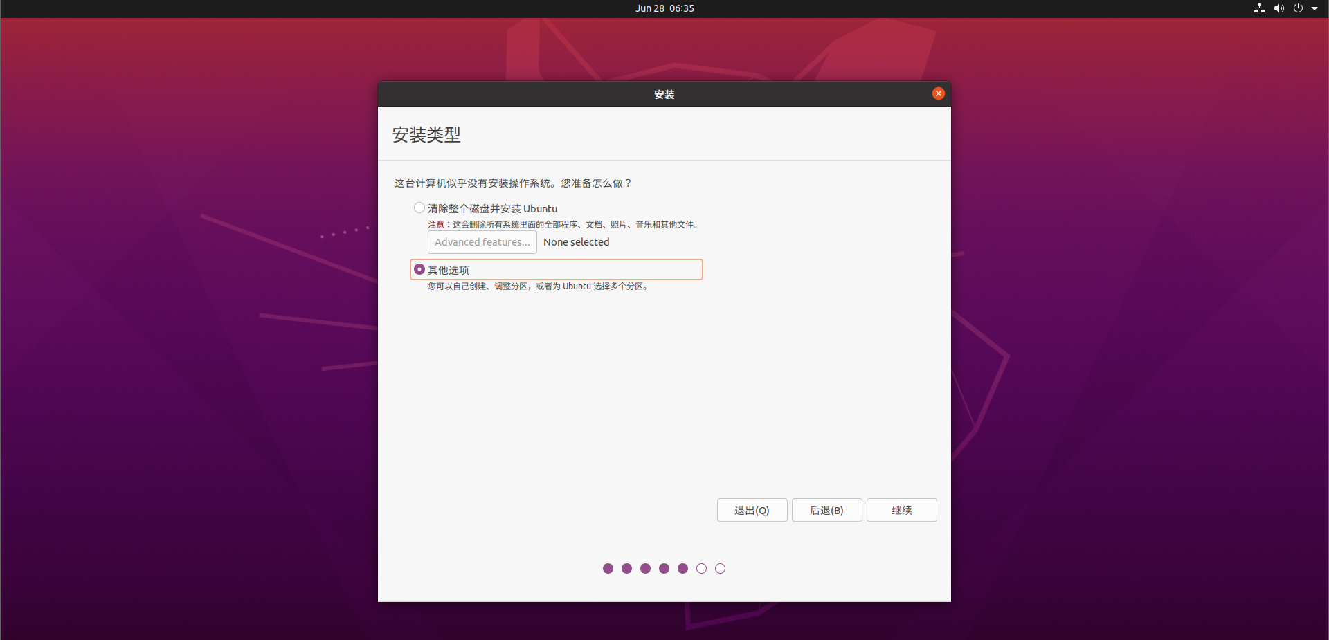 - 清除整个磁盘并安装 Ubuntu:这是一个非常暴力的选项,会将您电脑磁盘上所有的内容都进行格式化清除,然后在特定的分区上安装。由于过于暴力,一般情况下我们不使用这个选项。