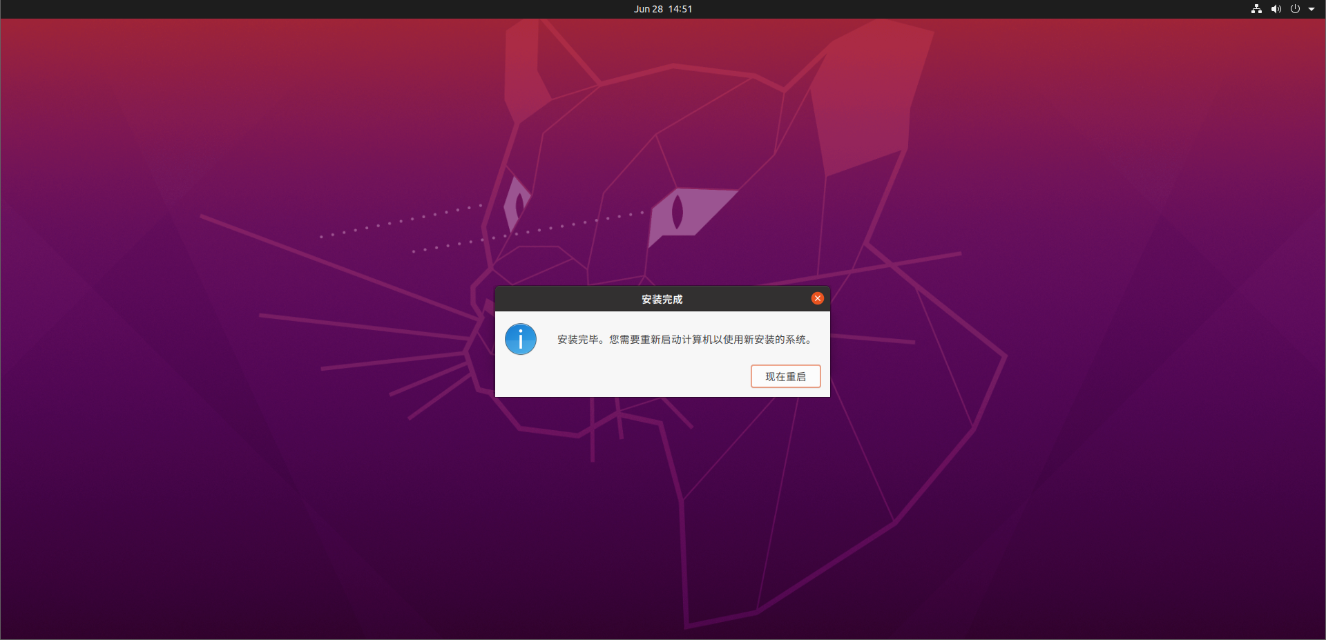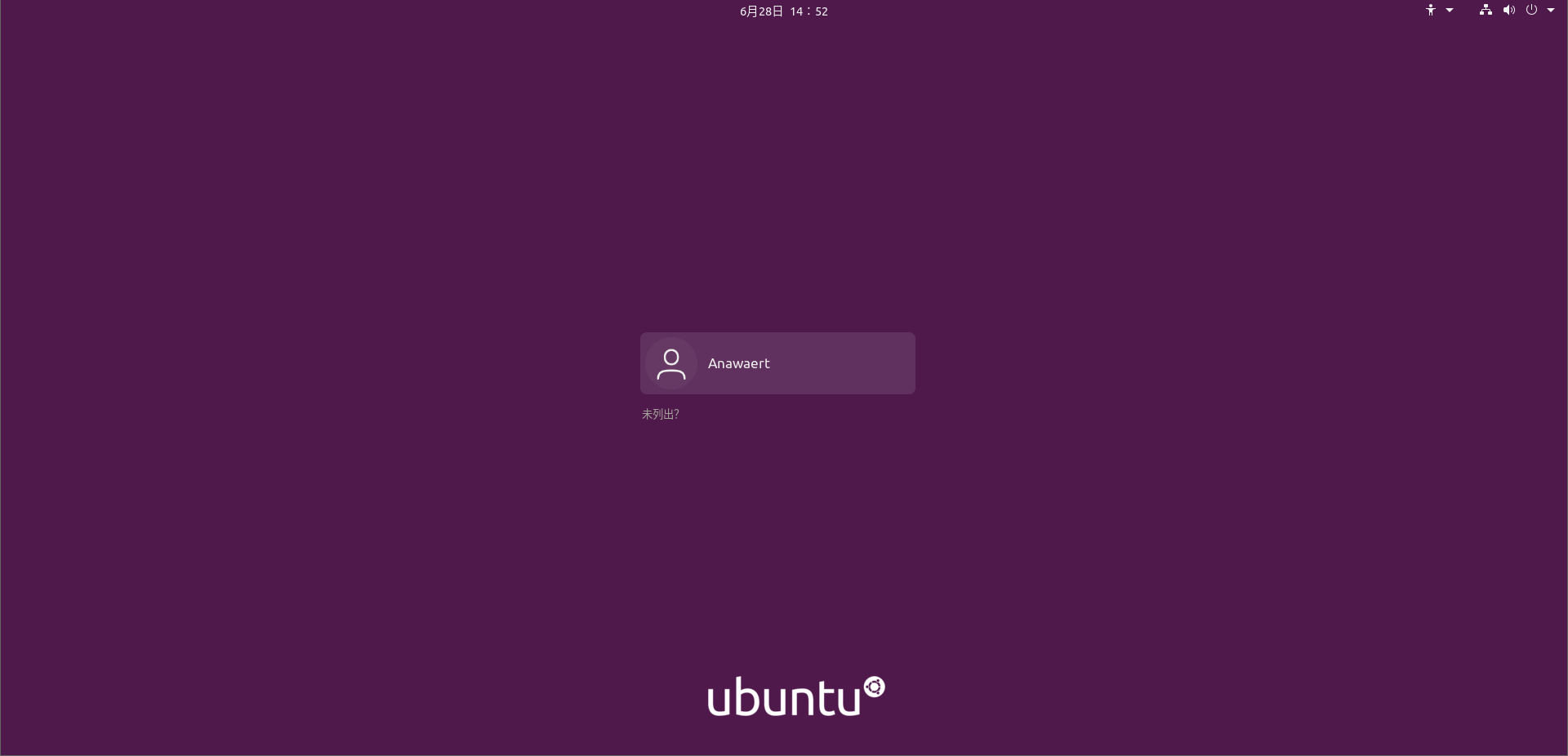 点击“现在重启”,在重启时,Ubuntu 会提示您“请移除安装介质,然后按下Enter键”。这时,我们可以拔下先前插上电脑的U盘,并按 Enter 以继续。电脑重启后,我们就会来到 Ubuntu 的锁屏界面,如下图所示: