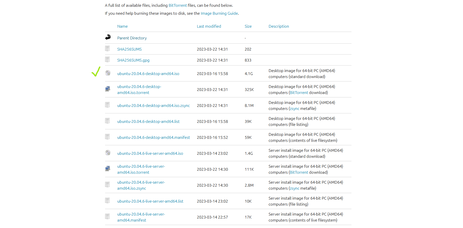 点开 Ubuntu 20.04.6 发行页 后,我们向下滑动,找到“ubuntu-20.04.6-desktop-amd64.iso”的镜像文件,点击即可下载。