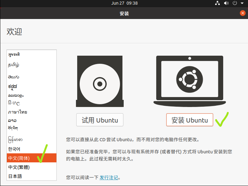 在右边的列表框中找到并选择“简体(中文)”,接着点击“安装 Ubuntu”:
