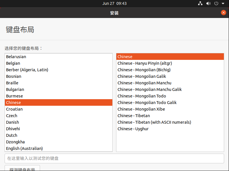 成功启动后,就会进入到 Ubuntu 的安装起始界面,首先是选择语言: