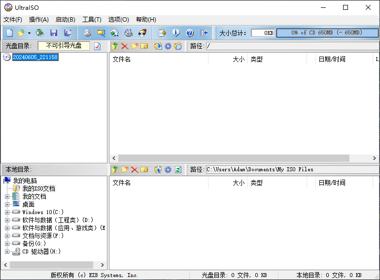 在下载完镜像,并完成 UltraISO 的安装后,我们打开 UltraISO,暂时不必理会 UltraISO 的注册提示,选择试用。程序打开后的界面如下: