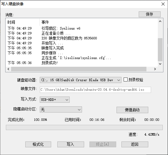 检查无误后,点击“写入”按钮进行启动U盘的制作。若无其它意外情况,将很快完成启动U盘的制作,完成时的 UltraISO 的界面和 Windows 资源管理器中的U盘如图所示。