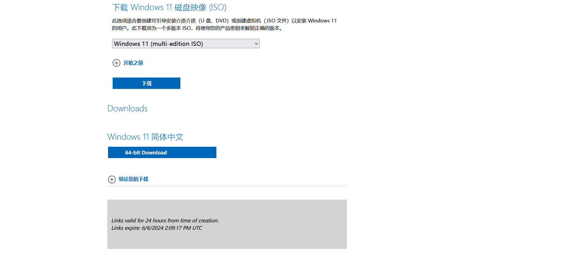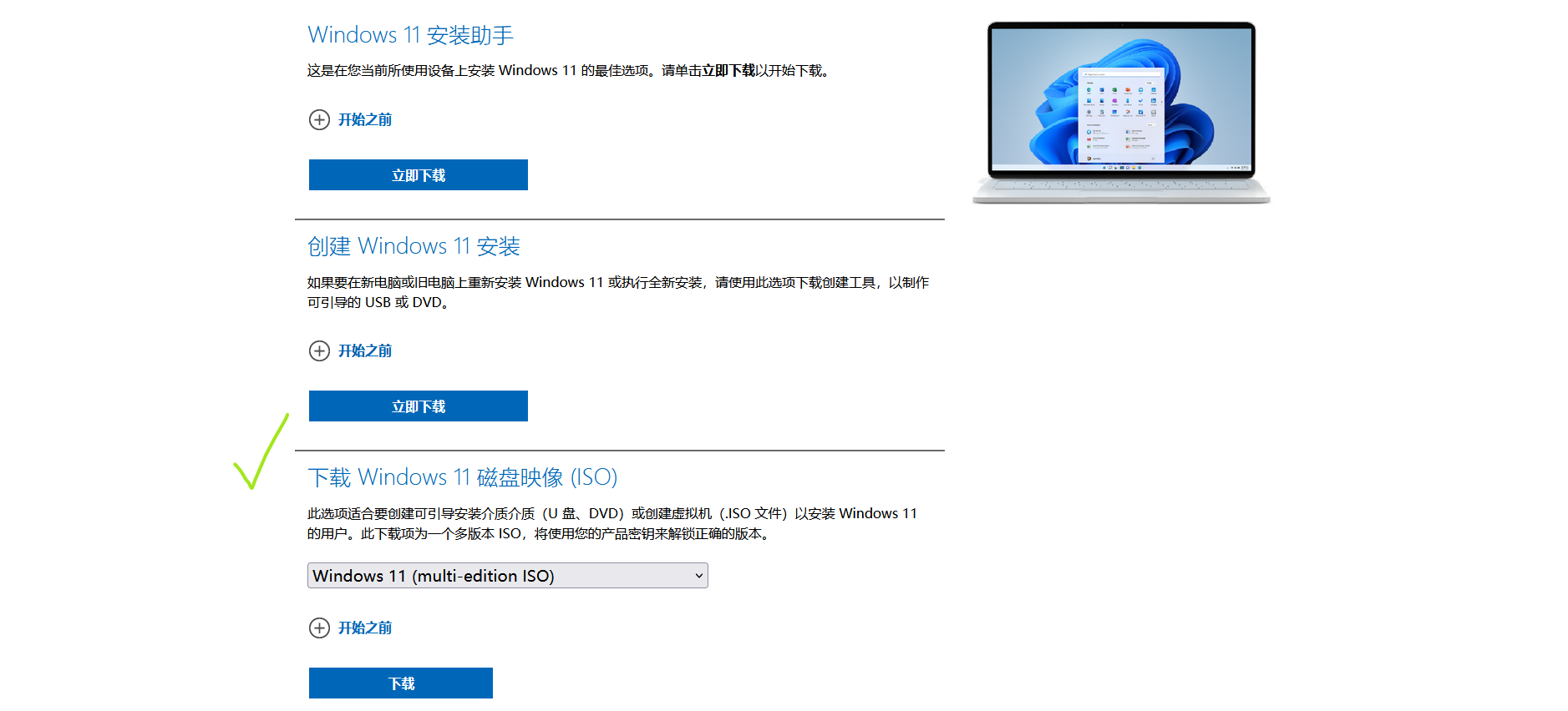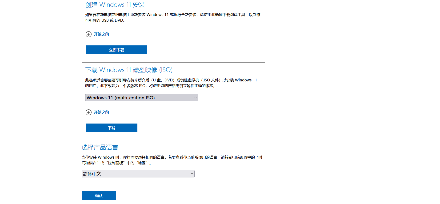 以Windows 11 下载(最新版为 23H2)为例,在该页面的“下载 Windows 11 磁盘映像 (ISO)”选项卡中选择下载项。若您的电脑是品牌机/品牌笔记本电脑,则可以直接选择“Windows 11家庭版”;若需要其它版本,则选择“Windows 11 (multi-edition ISO)”。选择完语言后,即可下载 Windows 11 镜像。