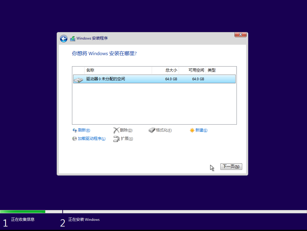 在“你想将 Windows 安装在哪里?”界面中,找到需要安装到的分区,选中并进行一些自定操作后,点击“下一页”即可。为方便起见,本文使用的是一块 64GiB 的未分配(未建立分区)空间以演示。