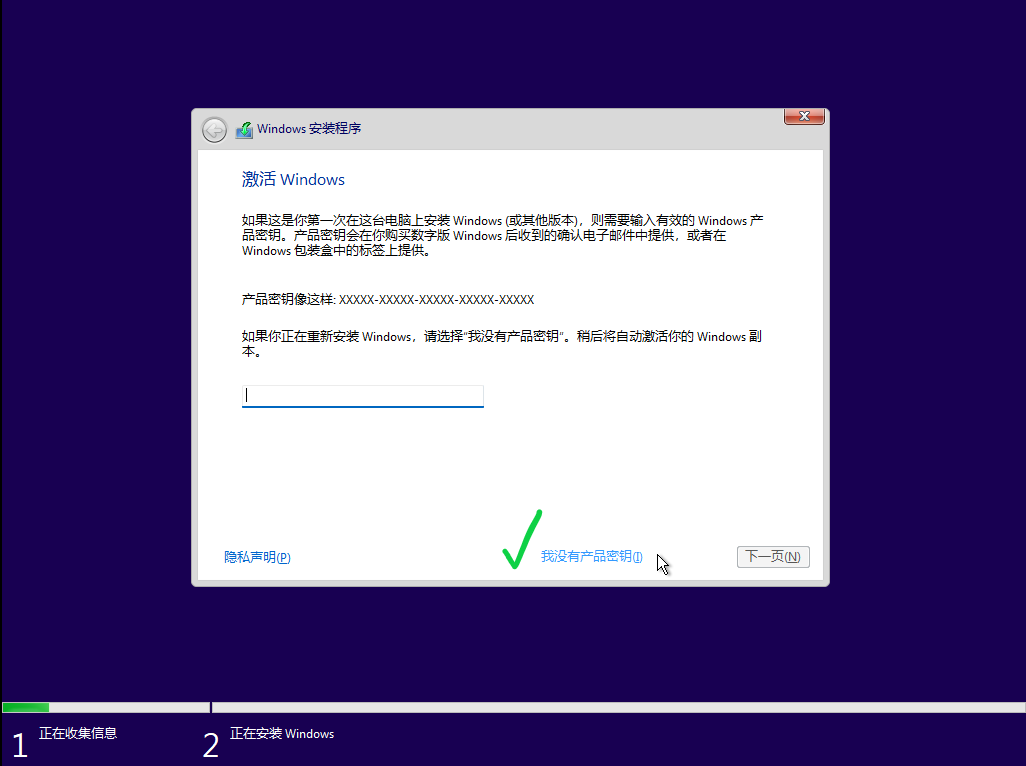 接下来,安装程序可能会提示你需要激活 Windows,若您有 Windows 11 的密钥,输入后即会自动跳转到“适用的声明与许可条款”页面,无需选择系统版本;若您暂时没有 Windows 11 的密钥,则先选择“我没有产品密钥”。