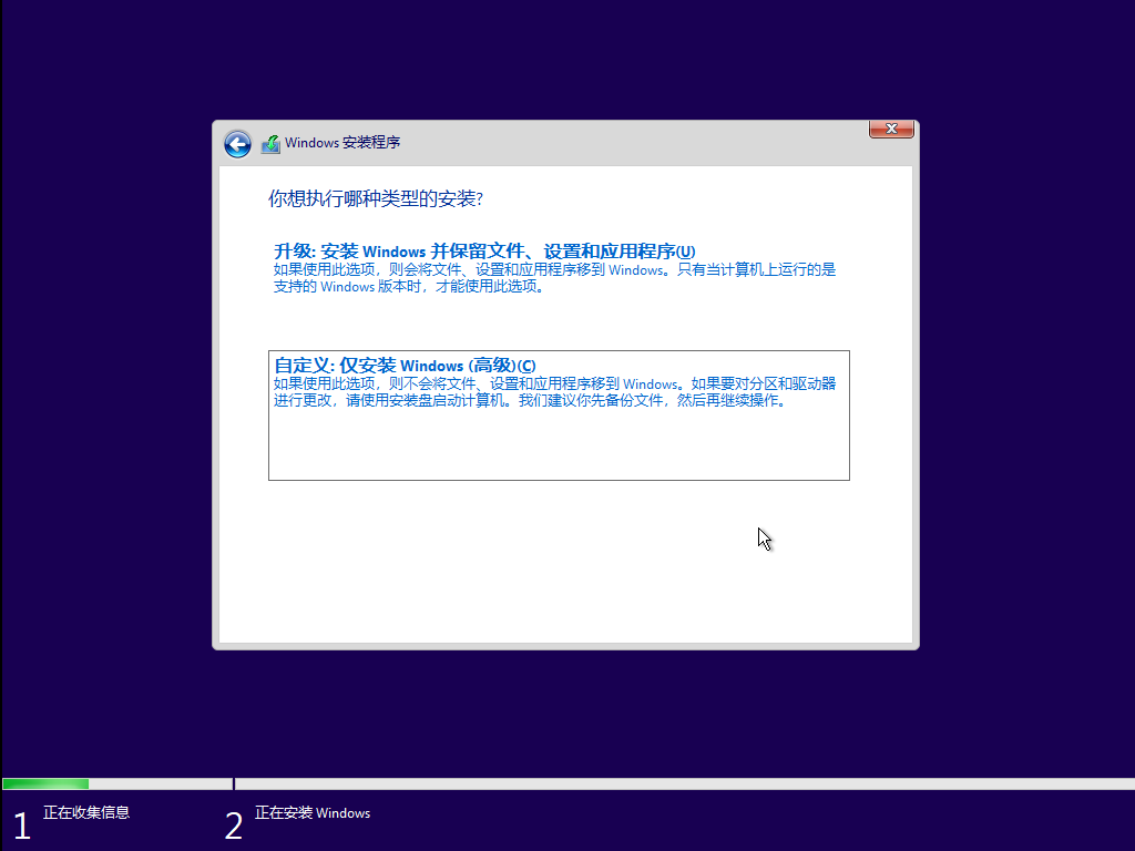 继续点击“下一页”,进入“你想执行哪种类型的安装?”页面。若选择“升级”,则意味着您已经安装过旧版的 Windows,且想将原来的系统较为无缝地迁移到新的 Windows 11 —— 您的用户文件夹、注册表项、系统设置与已安装程序都会随到新的系统中。虽然这听起来很美好,但是这种安装方式并不是“干净”的,会有相当多的历史文件堆积残留在文件系统中。况且,若只是想对 Windows 进行跨版本升级,实际上是不需要使用启动U盘这样的“第三方操作”的。因此,这里不讨论本页面中的“升级”方式。