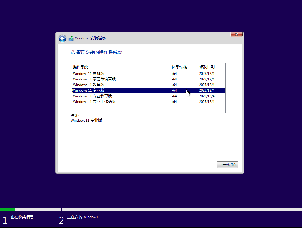 若上一步选择了“我没有产品密钥”,接下来就需要您选择需要安装的版本,此处以 Windows 11 专业版 x64 为例。(不清楚各 Windows 11 安装版本的区别?参见:比较 Windows 11 商业版)