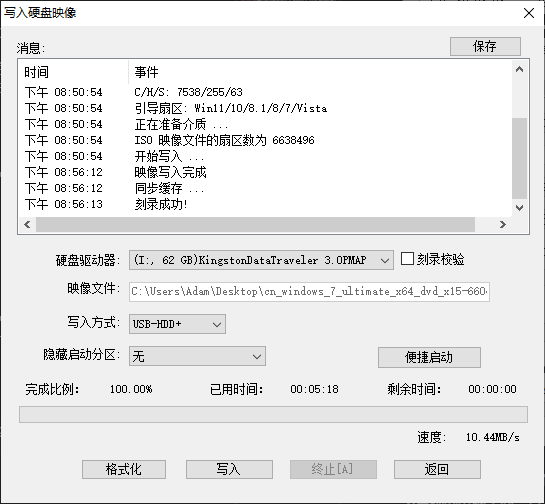 检查无误后,点击“写入”按钮进行启动U盘的制作。若无其它意外情况,将很快完成启动U盘的制作,完成时的 UltraISO 的界面和 Windows 资源管理器中的U盘如图所示。