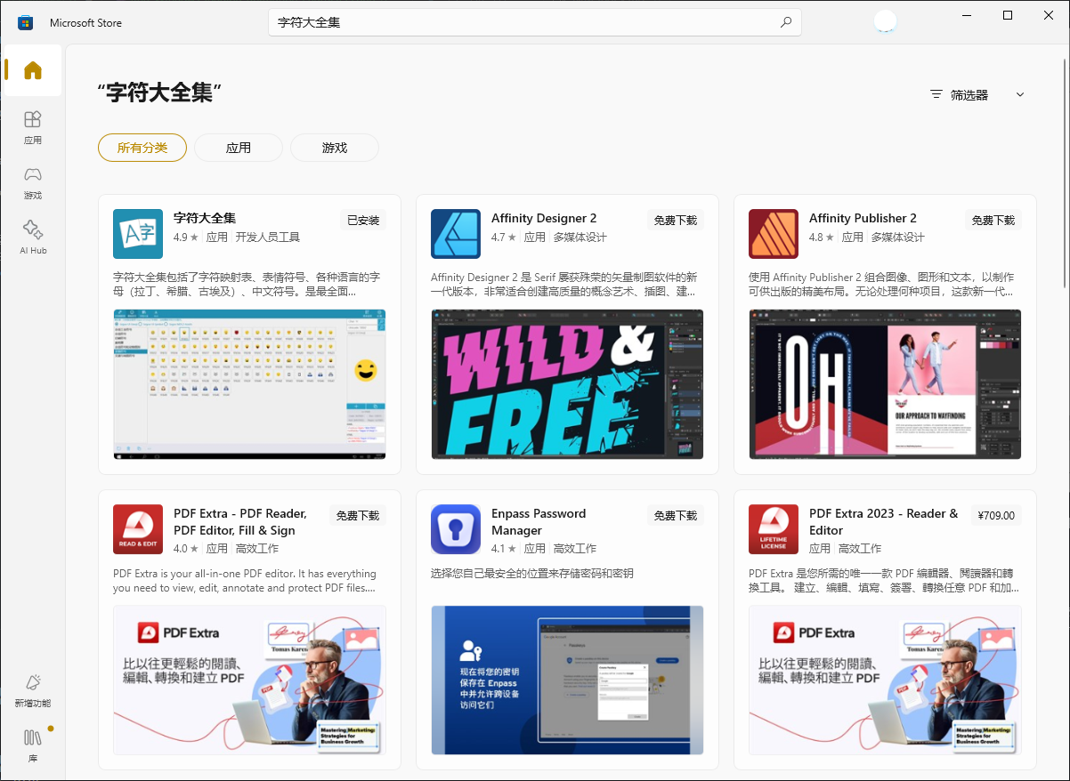 为了验证这一推理,我们打开“字符大全集”,该应用可由 Microsoft Store 下载安装: