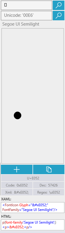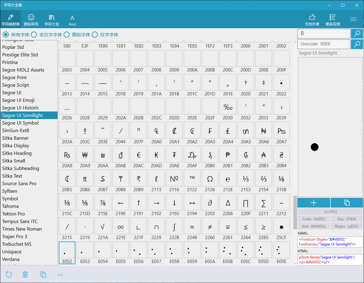 实际上,这里有一个问题:字体是字体,字体家族是字体家族,两者并不完全一一对应。前文中,我们发现 Segoe UI Semilight 缺了一些字体,而观察到以 U+E052