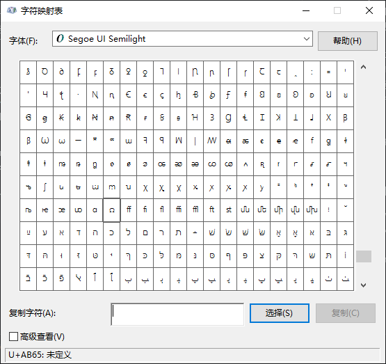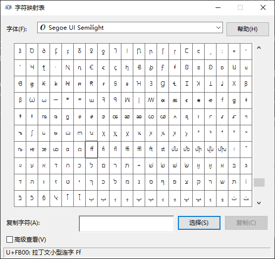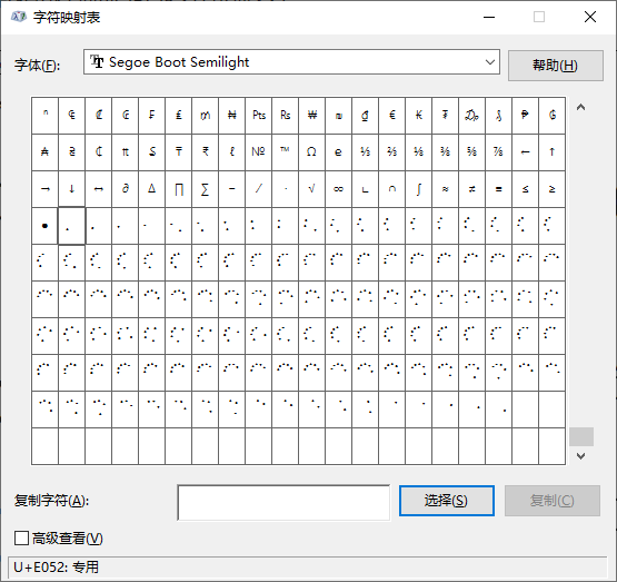 执行安装,这个时候再打开字符映射表,就找到 Segoe Boot Semilight 字体了。往下翻翻,就找到了我们需要的东西了: